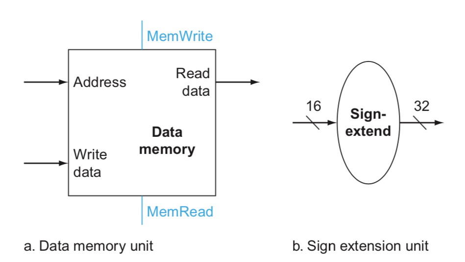 위 이미지 (강의 교재 figure 4.9) 는 이 단계에서 사용되는 두 유닛을 나타낸다. Sign Extension Unit은 16 bit 즉시값을 32 bit로 변환하는데 사용되고, Data Memory Unit은 메모리 주소를 입력받고 MemWrite, MemRead 플래그 상태에 따라 메모리를 읽거나 Write Data 입력으로 들어온 데이터(sw일 때 Rt의 값)를 메모리에 쓴다. 이 때, 메모리 주소는 (Rs 레지스터에 들어 있는 베이스 주소 + Sign Extension한 offset)으로 결정된다. lw이면 Read Data를 Rt에 저장하기 위해 Registers의 Write Data로 연결해준다. 지금까지 나온 부분을 합쳐서 그리면 아래 이미지와 같다.