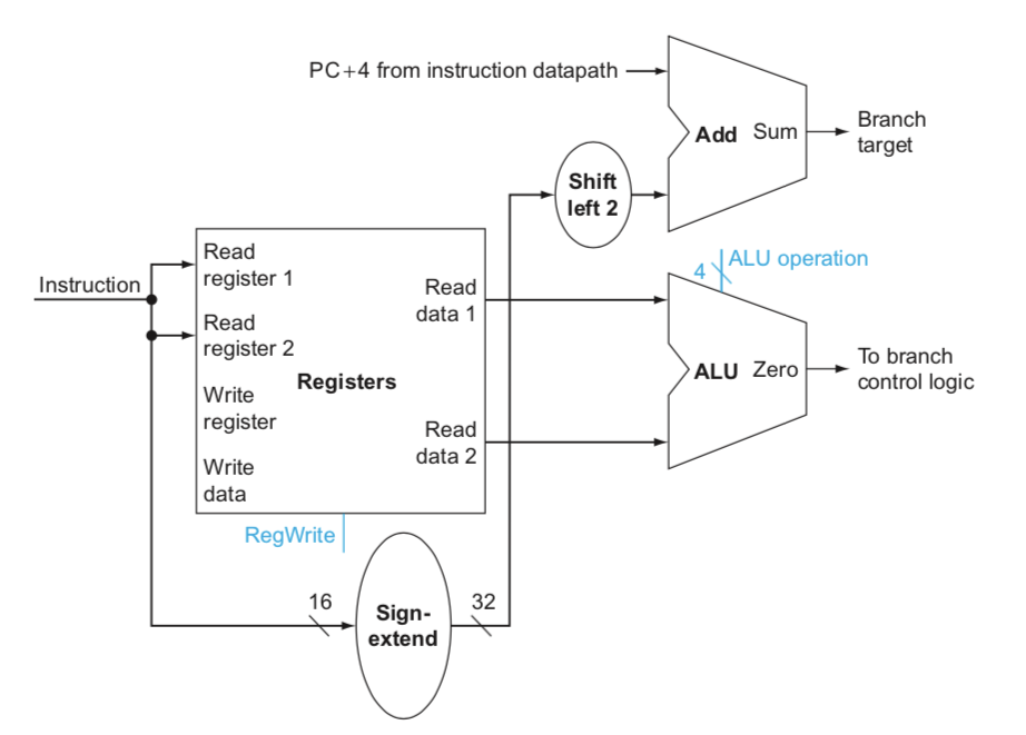 Branch Target Address는 (PC + 4) + (offset * 4)으로 계산할 수 있고 (이것도 2장에서 이미 언급), 두 레지스터(Rs, Rt)의 값이 같으면 이 주소가 PC에 저장된다. 두 레지스터의 값을 비교할 때는 ALU에서 두 값을 뺀 다음, Zero 출력이 1이 되는지 확인한다. ALU의 Zero는 연산의 결과가 0이면 1이되고 아니면 0이 되는 출력값이다. ALU에는 출력이 ALU Result와 Zero 총 2개가 있다고 생각하면 된다.