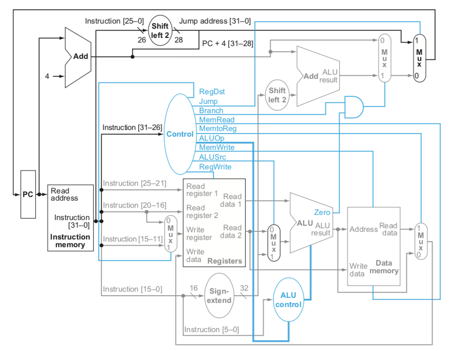 이 부분은 ALU Control이 아니라 전체적인 동작을 제어하는 메인 Control에 대해 알아본다. 아래 이미지는 4.3에서 보여준 전체 회로이다.