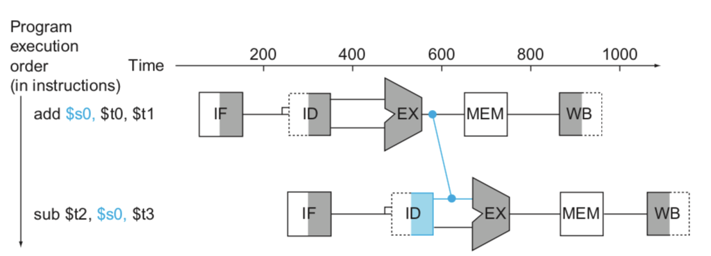 $s0에 들어갈 값은 EX에서 결정되던 이전 상황과는 달리 MEM에서 결정된다. Forwarding을 하더라도 lw의 MEM 단계 이후에 sub의 EX가 나와야 하기 때문에 아래 이미지와 같다.