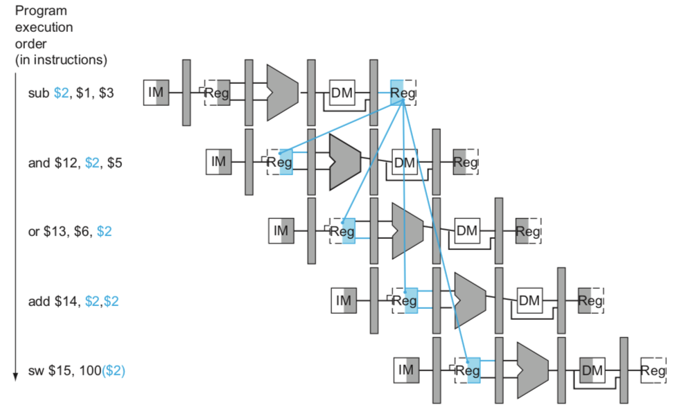 여기서 파란색은 $2를 쓰거나 읽는 부분인데, 첫 줄에서 $s2가 저장되기 전에 $2를 읽는 곳은 and, or 두 군데이다. 즉, Data Hazard가 발생했으며 이를 해결하기 위해서는 Forwarding이 필요하다. 이 경우에는 sub 의 EX 단계 ALU 결과를 and, or의 EX 입력으로 연결해 주어야 한다.